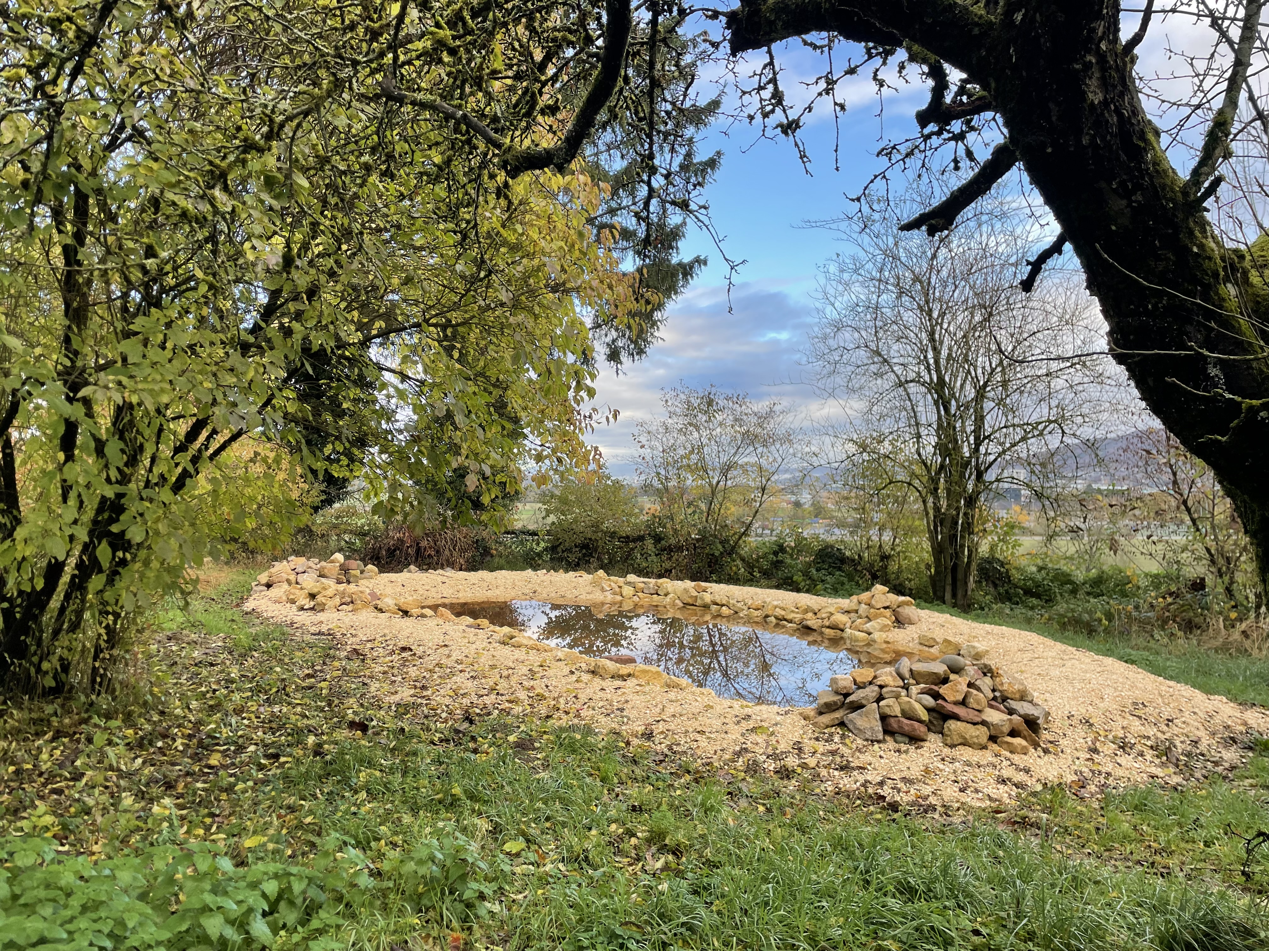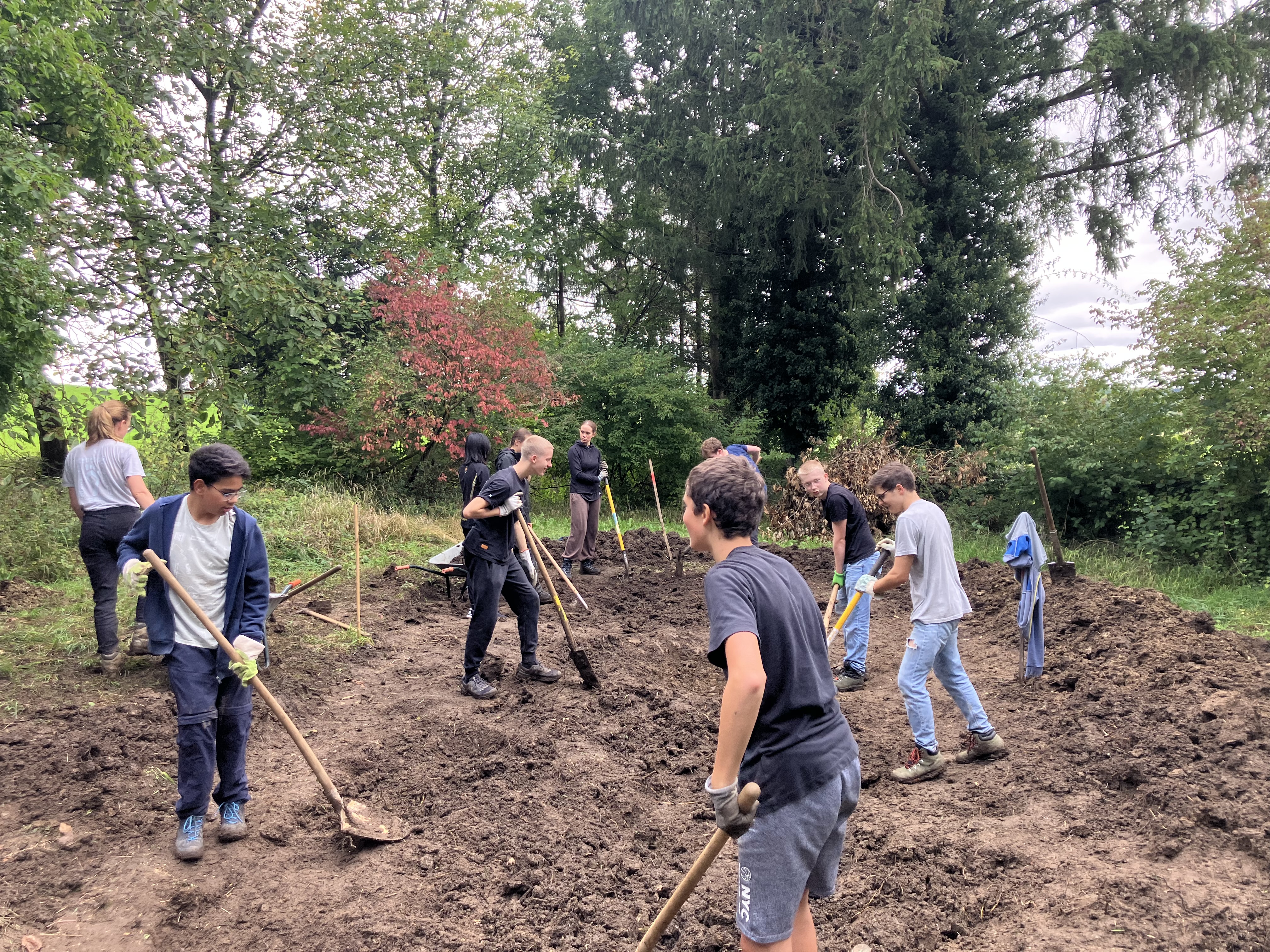 Die 3. Klasse der Sekundarschule Münchenstein baute im ehemaligen Garten von A. Vogel in Aesch den bislang grössten Weiher, der im Rahmen dieses Projekts entstanden ist. Der erste Tag war von starkem Regen geprägt – die Motivation sank, und das Graben gestaltete sich durch den nassen, schweren Boden besonders mühsam.