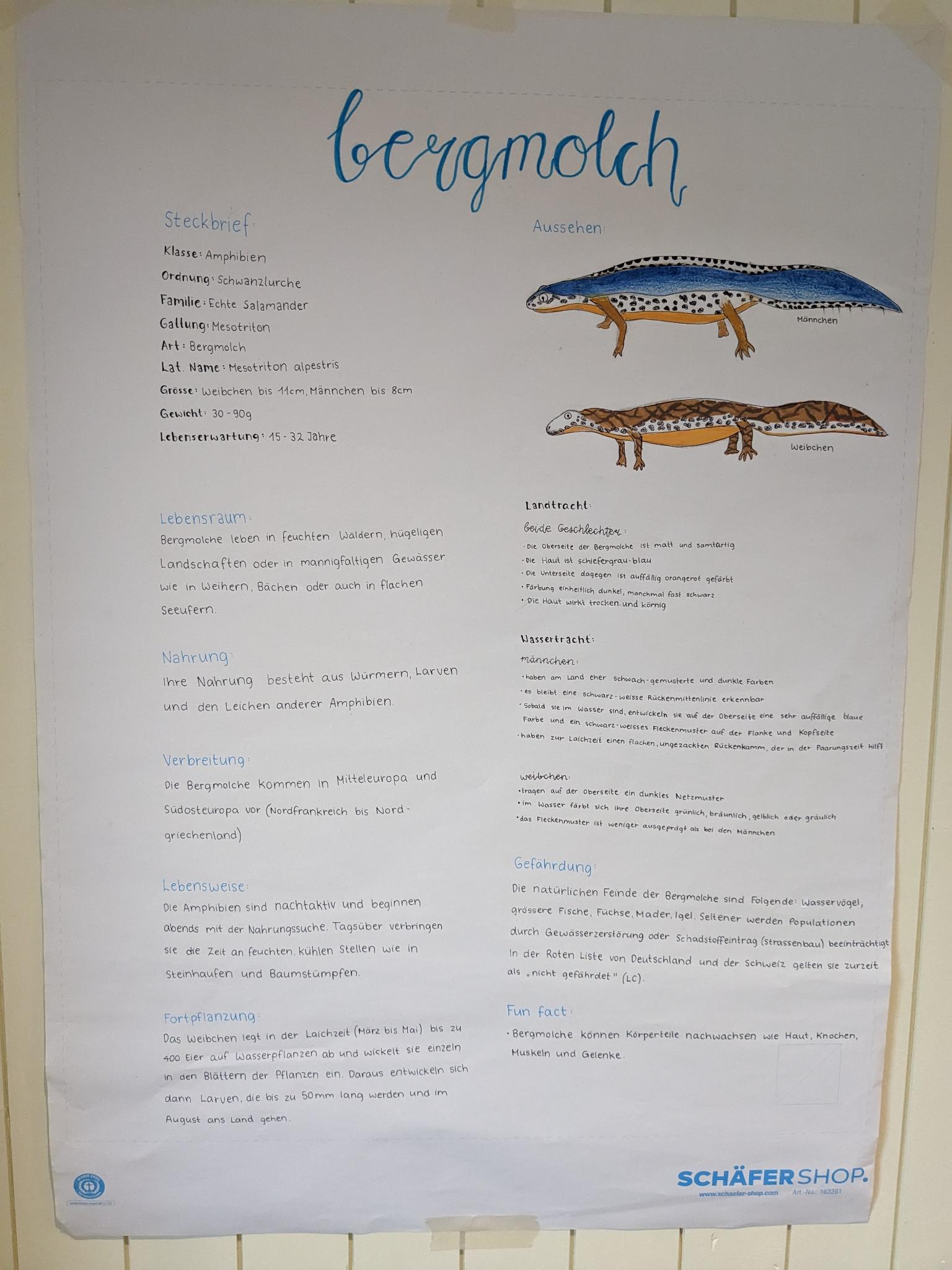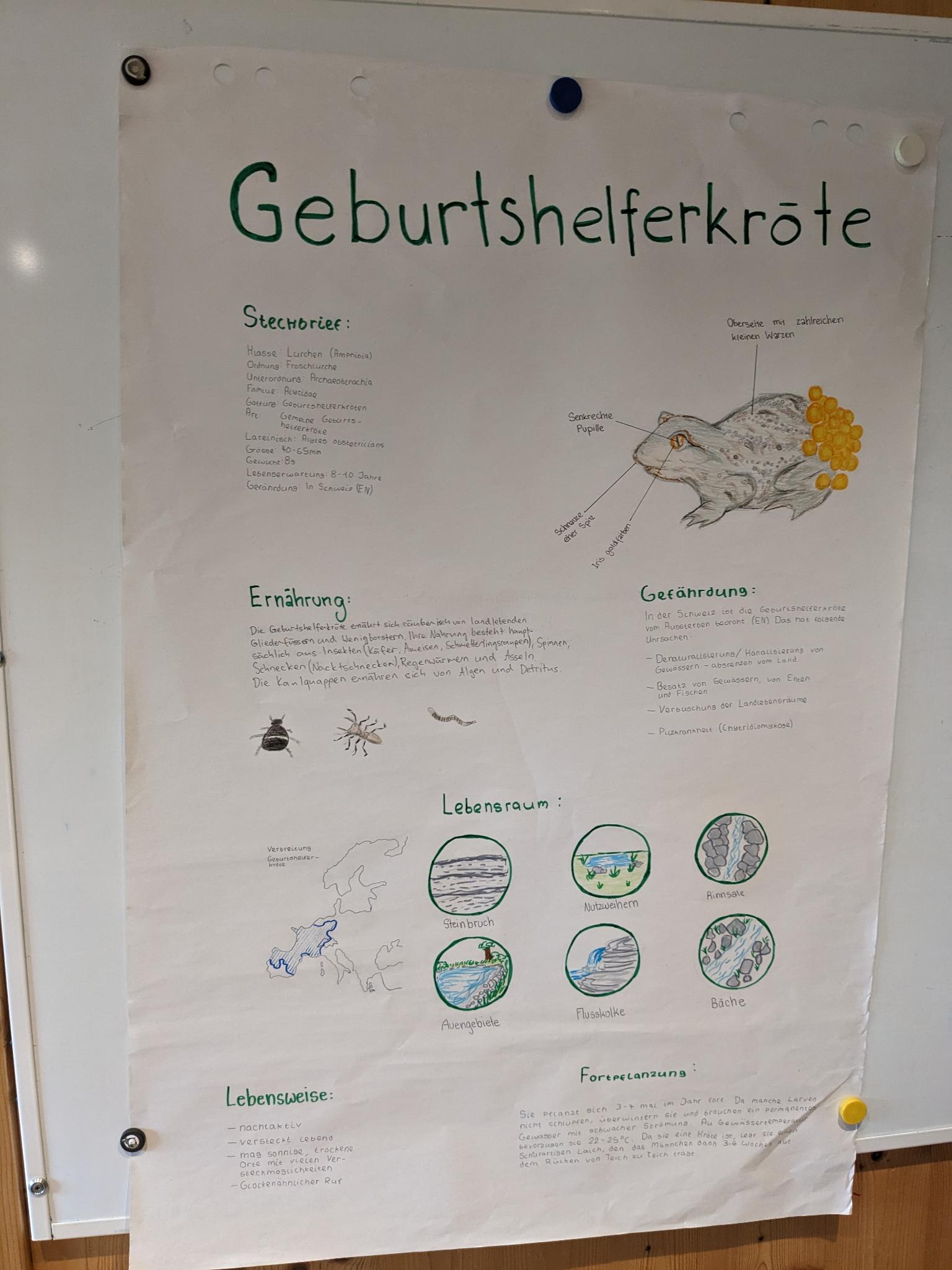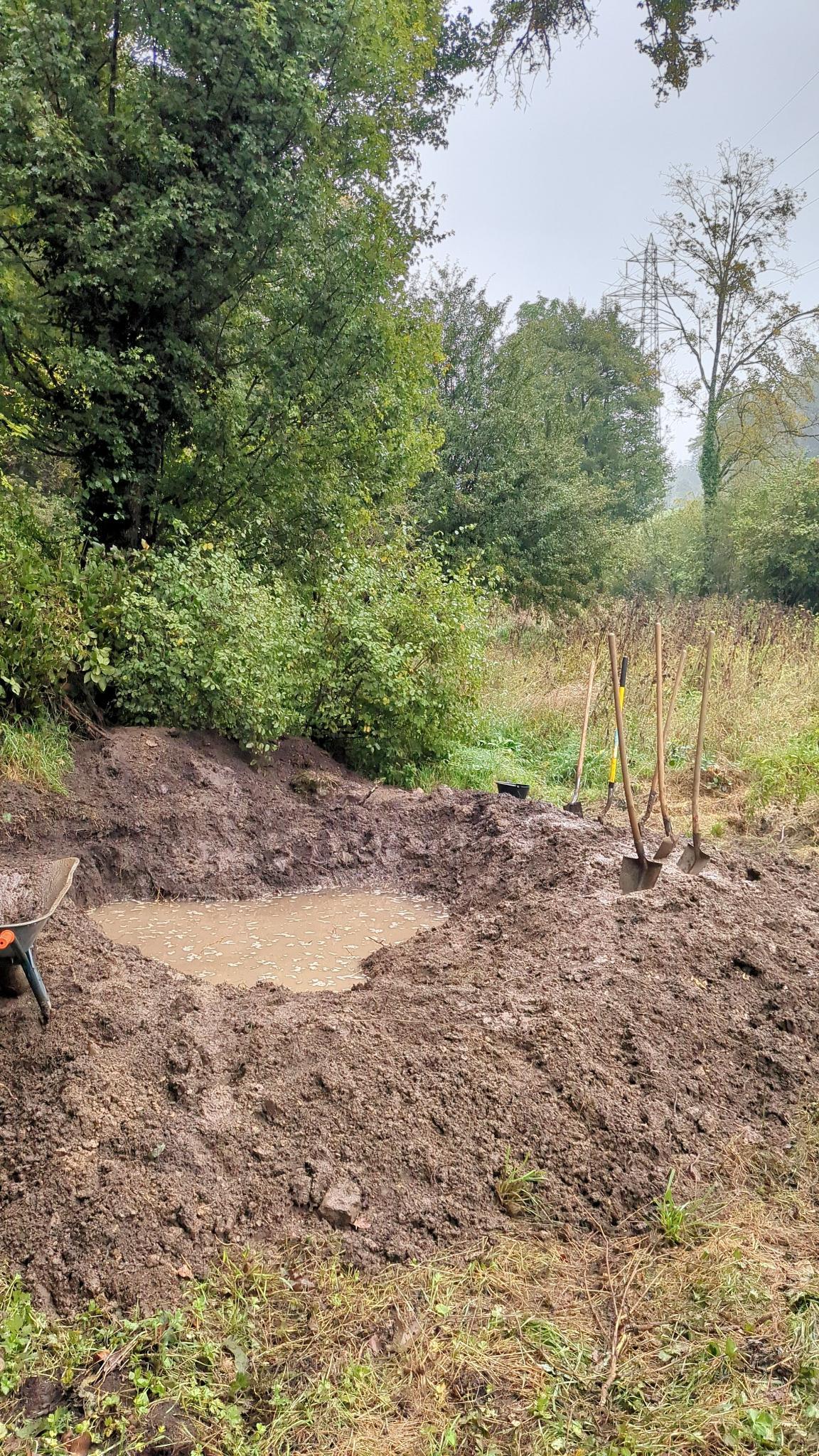 In der Woche vom 22. bis 26. September 2025 hatten wir die Möglichkeit, in Form eines Kennenlernlagers am Gymnasium das Pro Natura Programm durchzuführen. Während dieser 5 Tage konnten wir Amphibien und ihre Lebensräume näher kennenlernen. Die Klasse wurde in 4 Gruppen eingeteilt und jede Gruppe hat jede der folgenden vier Aktivitäten gemacht: Weiher bauen, an Kleinstrukturen arbeiten, eine Exkursion machen und ein Plakat über ein einheimisches Amphib gestalten. Zusätzlich haben wir gekocht und geputzt, was aber nicht zum ProNatura-Programm dazugehört. Am Weiher haben wir zuerst die Fläche abgemessen (4,5 m auf 4 m), danach angefangen, mit Schaufeln das Loch zu graben. Am ersten Tag ist das relativ gut gegangen, über Nacht hat es jedoch geregnet, wodurch die Arbeit am zweiten Tag erschwert war. Wir mussten das Regenwasser zuerst ausschöpfen, bevor wir das geplante Programm weiterführen konnten. Dann haben wir eine Folie und das schützende Vlies in das Loch gelegt. Zum Schluss haben wir den Weiher mit einigen Steinen von verschiedenen Grössen geschmückt und abgedeckt. Wir waren eigentlich motiviert, hatten aber die ganze Woche Pech mit dem Wetter. Bei den Kleinstrukturen konnten wir freie Fläche generieren, um damit die Biodiversität in der Schweiz zu fördern. Dabei haben wir Sträucher – vor allem Brombeersträucher – und kleine Bäume zurückgeschnitten und mit einem Rechen den Boden von abgefallenen Blättern und Gräsern befreit. Auch diese Arbeit war zwar für einen guten Zweck, war aber wegen des Wetters und der Dornen sehr anstrengend. Die Exkursion war ein langer Spaziergang, bei dem wir etwas über einheimische Tiere, deren Lebensraum und die Wichtigkeit von Bienen gelernt haben. Wir haben uns angeschaut, was in einem bestimmten Gebiet nötig ist, damit es zu einem Lebensraum für bestimmte Tiere werden kann. Dieses Wissen kann für die Zukunft hilfreich sein. Das Plakat über ein Amphib zu gestalten, war eine erwünschte Abwechslung von körperlicher Arbeit. Es war toll, zusammen kreativ zu sein. Jede Gruppe konnte ein einheimisches Amphib auswählen und darüber mit interessanten Informationen ein Plakat gestalten. Vor allem konnten wir das im Trockenen machen. Zum Schluss hat jede Gruppe ihr Plakat vorgestellt. Diese Woche war eine tolle Gelegenheit, etwas Gutes für die Umwelt zu tun, neue Sachen zu lernen und die Klasse besser kennenzulernen. Unsere Erwartungen wurden trotz der wetterlichen Umstände übertroffen. Am Freitag sind wir zur Entspannung ins SoleUno gegangen. Wir bedanken uns herzlich bei Pro Natura für diese Woche.