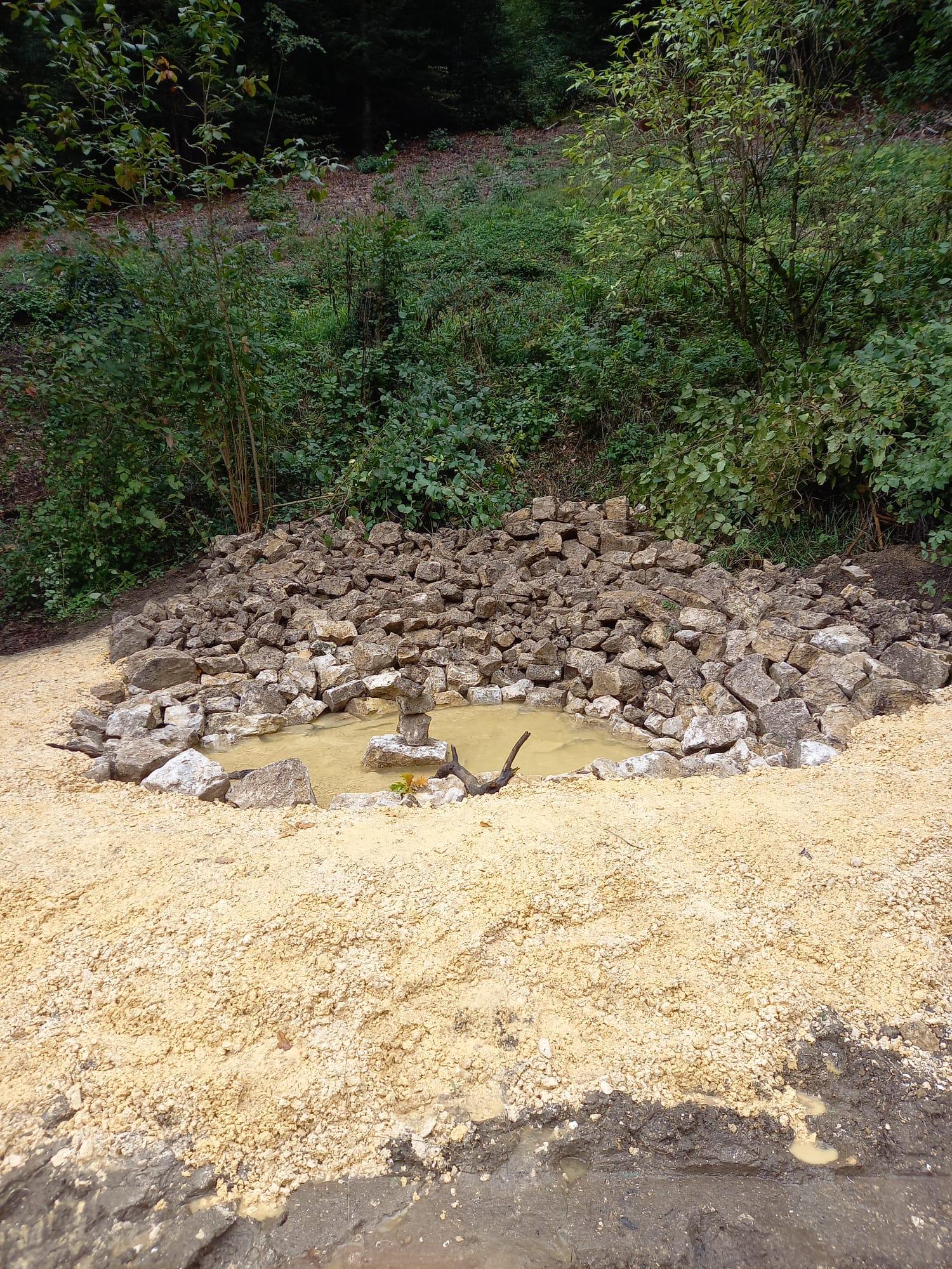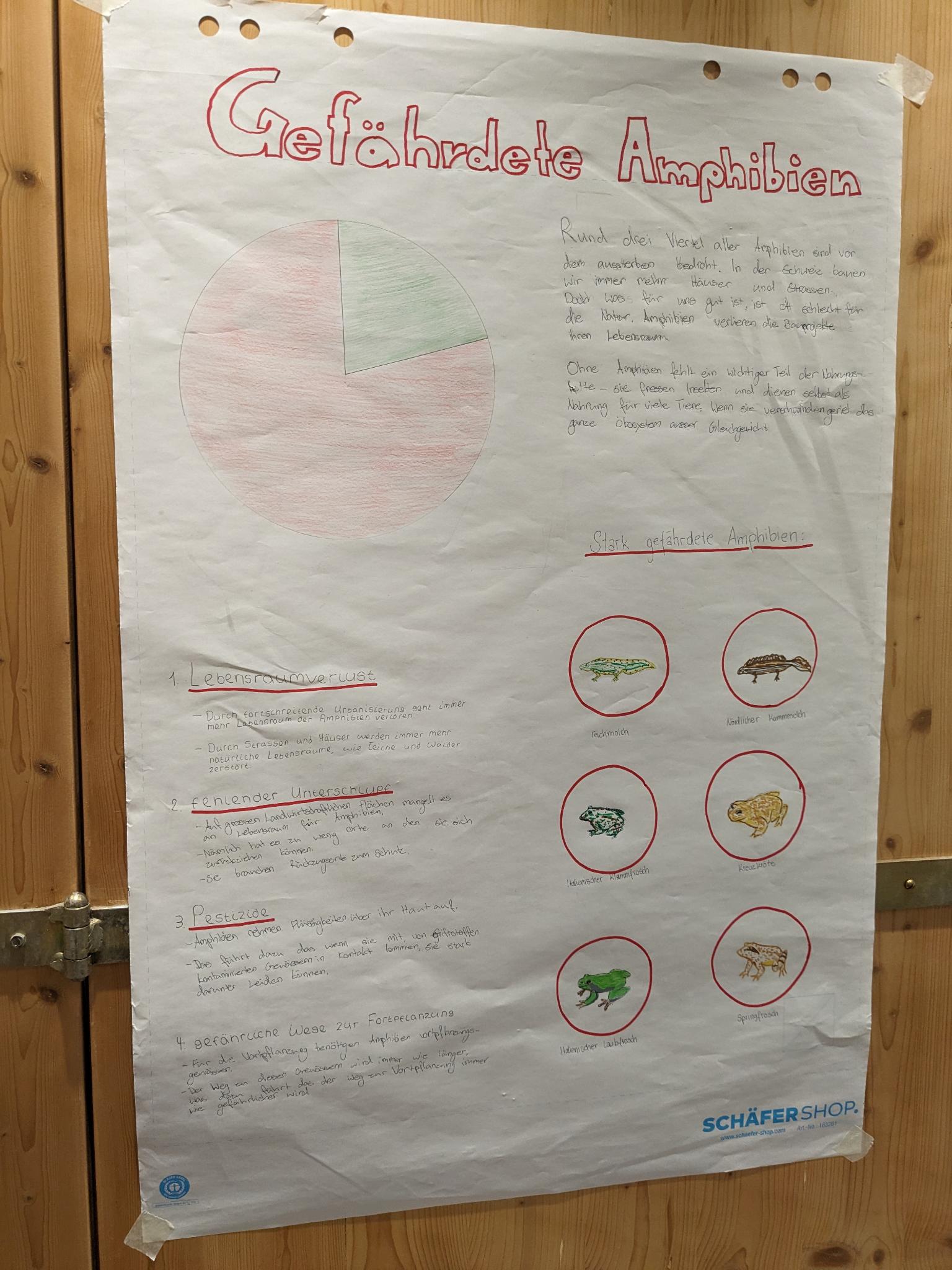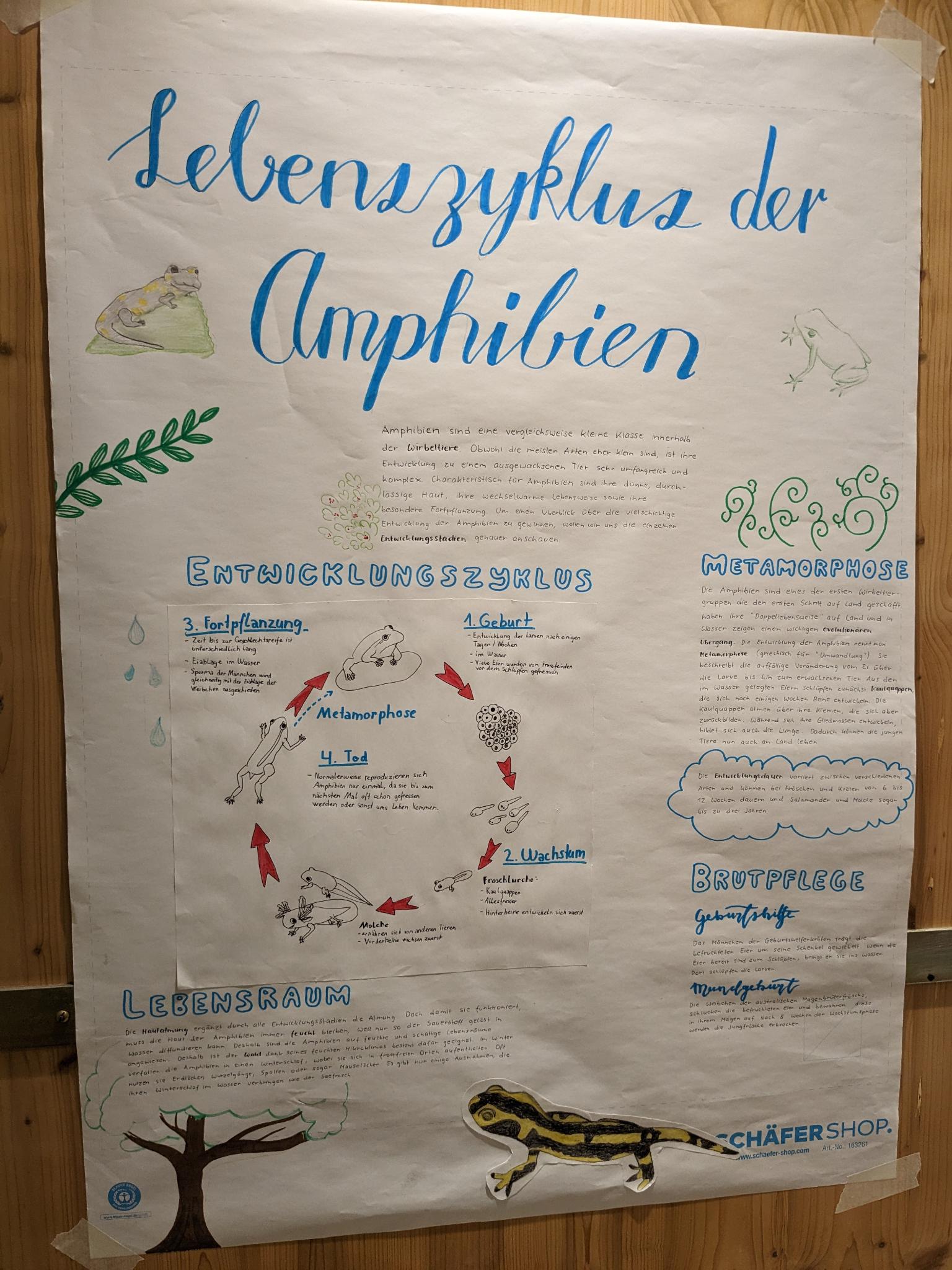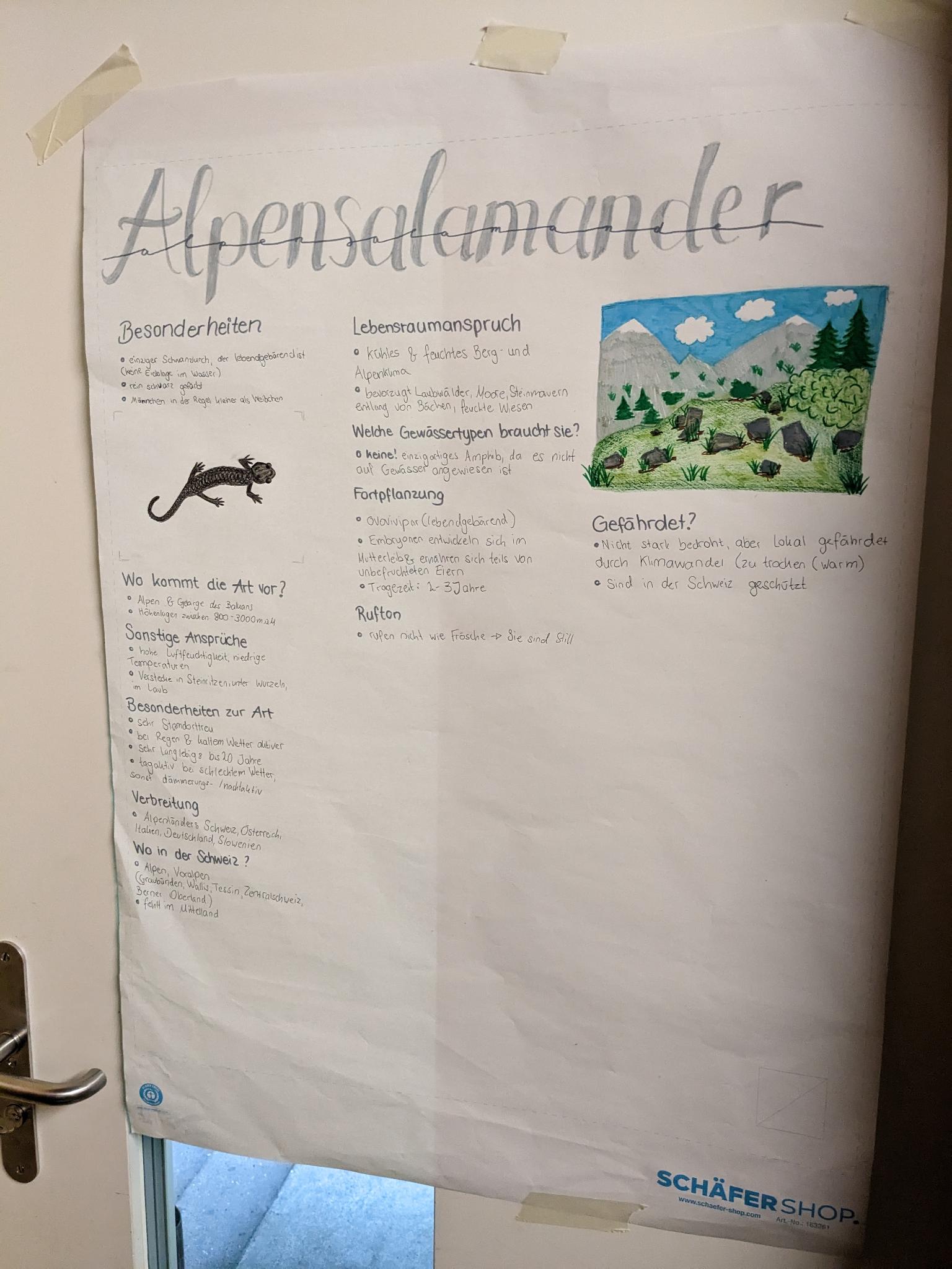 In der Woche vom 22. bis 26. September 2025 hatten wir die Möglichkeit, in Form eines Kennenlernlagers am Gymnasium das Pro Natura Programm durchzuführen. Während dieser 5 Tage konnten wir Amphibien und ihre Lebensräume näher kennenlernen. Die Klasse wurde in 4 Gruppen eingeteilt und jede Gruppe hat jede der folgenden vier Aktivitäten gemacht: Weiher bauen, an Kleinstrukturen arbeiten, eine Exkursion machen und ein Plakat über ein einheimisches Amphib gestalten. Zusätzlich haben wir gekocht und geputzt, was aber nicht zum ProNatura-Programm dazugehört. Am Weiher haben wir zuerst die Fläche abgemessen (4,5 m auf 4 m), danach angefangen, mit Schaufeln das Loch zu graben. Am ersten Tag ist das relativ gut gegangen, über Nacht hat es jedoch geregnet, wodurch die Arbeit am zweiten Tag erschwert war. Wir mussten das Regenwasser zuerst ausschöpfen, bevor wir das geplante Programm weiterführen konnten. Dann haben wir eine Folie und das schützende Vlies in das Loch gelegt. Zum Schluss haben wir den Weiher mit einigen Steinen von verschiedenen Grössen geschmückt und abgedeckt. Wir waren eigentlich motiviert, hatten aber die ganze Woche Pech mit dem Wetter. Bei den Kleinstrukturen konnten wir freie Fläche generieren, um damit die Biodiversität in der Schweiz zu fördern. Dabei haben wir Sträucher – vor allem Brombeersträucher – und kleine Bäume zurückgeschnitten und mit einem Rechen den Boden von abgefallenen Blättern und Gräsern befreit. Auch diese Arbeit war zwar für einen guten Zweck, war aber wegen des Wetters und der Dornen sehr anstrengend. Die Exkursion war ein langer Spaziergang, bei dem wir etwas über einheimische Tiere, deren Lebensraum und die Wichtigkeit von Bienen gelernt haben. Wir haben uns angeschaut, was in einem bestimmten Gebiet nötig ist, damit es zu einem Lebensraum für bestimmte Tiere werden kann. Dieses Wissen kann für die Zukunft hilfreich sein. Das Plakat über ein Amphib zu gestalten, war eine erwünschte Abwechslung von körperlicher Arbeit. Es war toll, zusammen kreativ zu sein. Jede Gruppe konnte ein einheimisches Amphib auswählen und darüber mit interessanten Informationen ein Plakat gestalten. Vor allem konnten wir das im Trockenen machen. Zum Schluss hat jede Gruppe ihr Plakat vorgestellt. Diese Woche war eine tolle Gelegenheit, etwas Gutes für die Umwelt zu tun, neue Sachen zu lernen und die Klasse besser kennenzulernen. Unsere Erwartungen wurden trotz der wetterlichen Umstände übertroffen. Am Freitag sind wir zur Entspannung ins SoleUno gegangen. Wir bedanken uns herzlich bei Pro Natura für diese Woche.