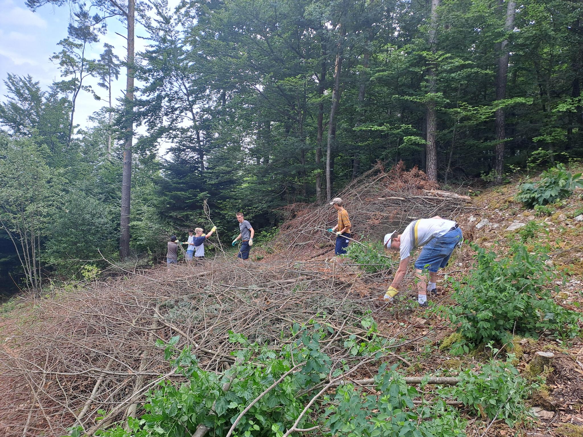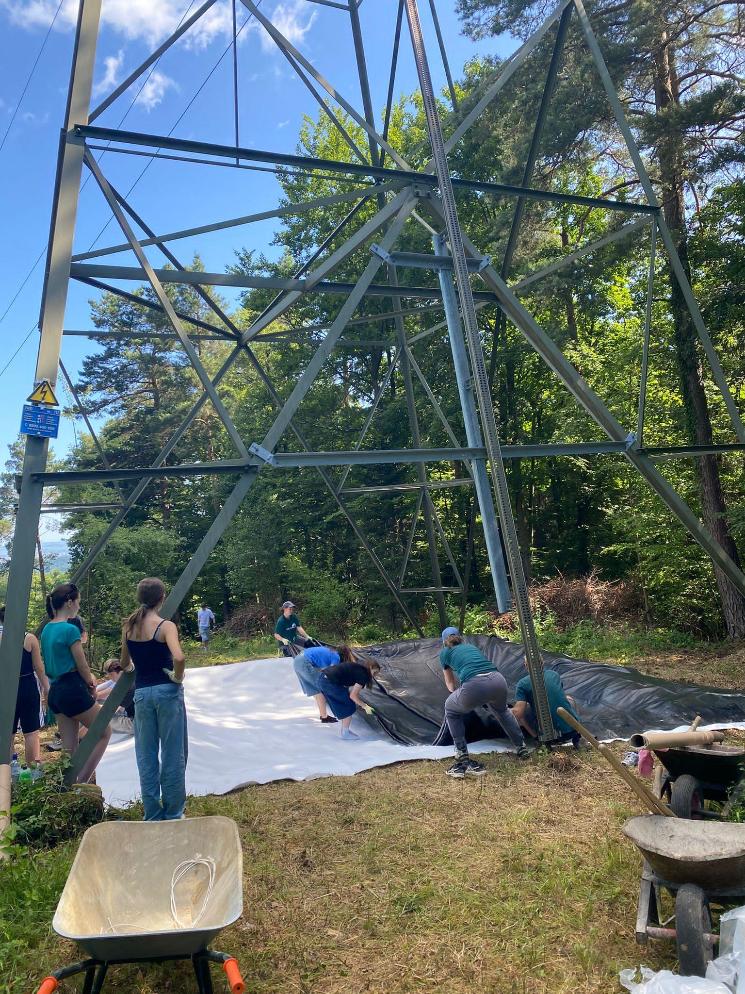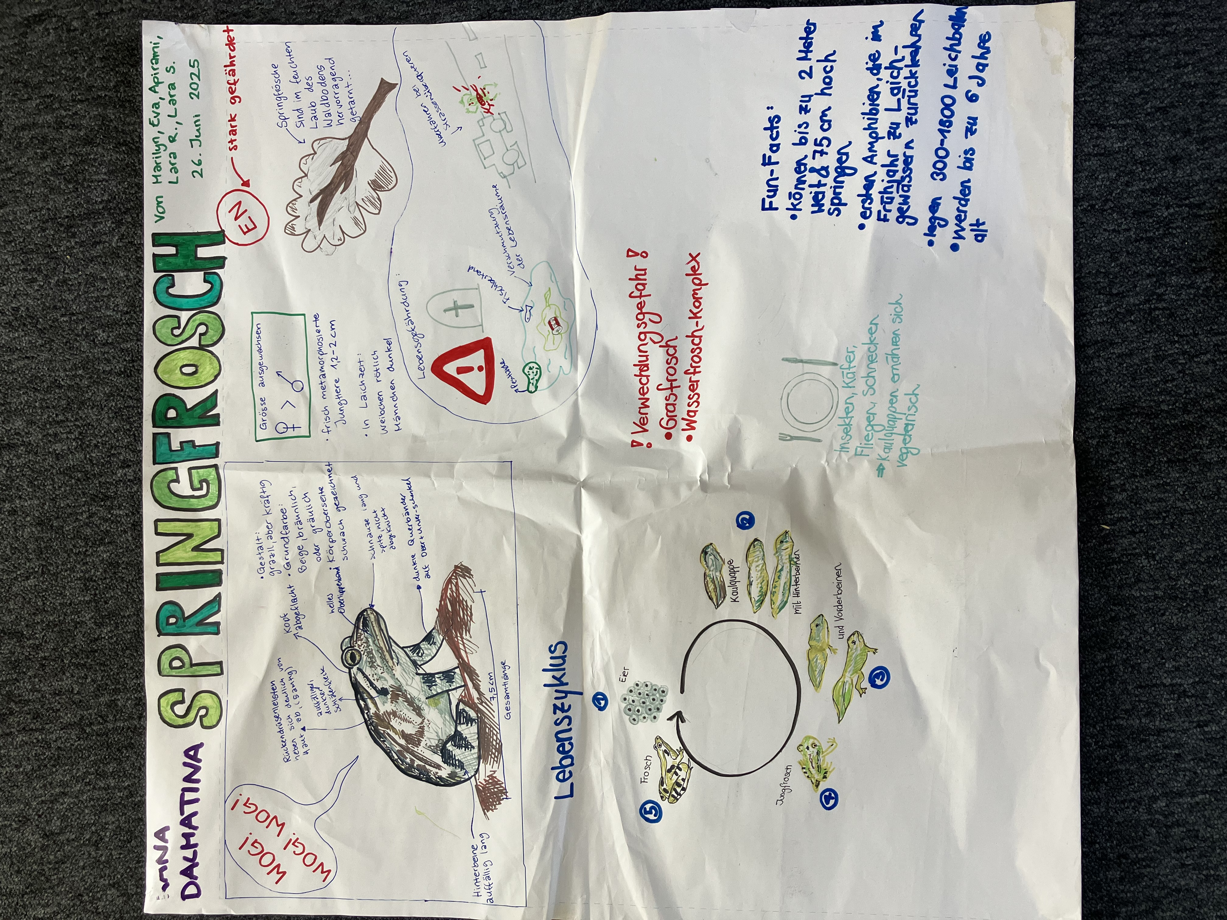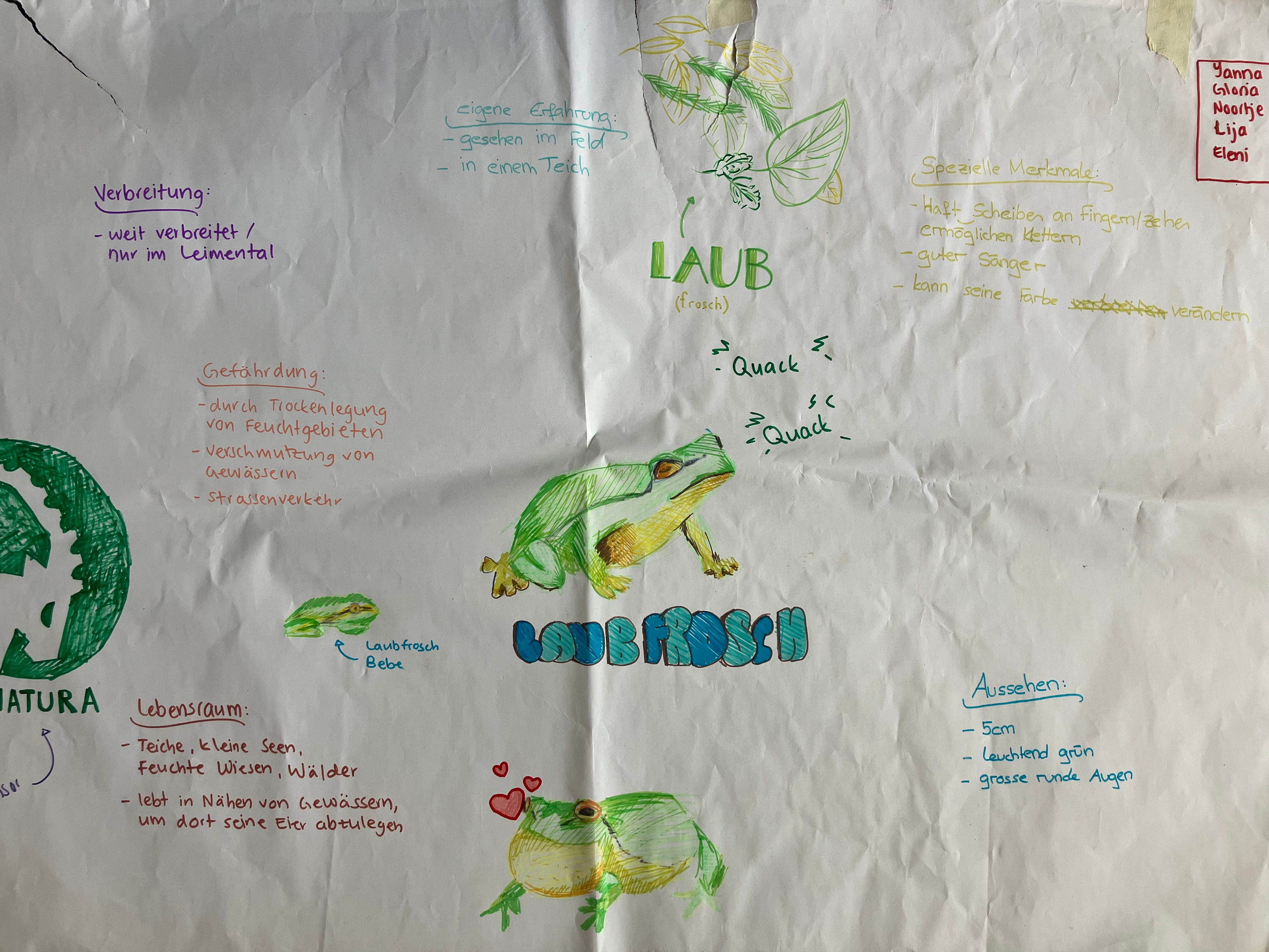 In der NaWi-Woche des Gymnasiums Leonhard haben insgesamt vier verschiedene 1. Klassen in Pfeffingen an einem Weiher weitergearbeitet, den zuvor eine Klasse des Gymnasiums Kirschgarten begonnen hatte. Neben dem Weiherbau hat jeweils eine Gruppe Asthaufen aus herumliegendem Material der Durchforstung angelegt, auf dem Feuer gekocht und ein Amphibienporträt erstellt.